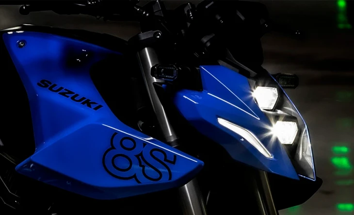 As linhas firmes e limpas de sua frente e traseira contrastam com a massa muscular em seu centro. Cada detalhe, até ao design distintivo do novo escapamento curto, apresenta o apelo futurista do estilo fino e compacto que transmite instantaneamente o potencial de desempenho na sua postura agressiva com a massa do copo avançada. Isto é destacado pela exposição total e exibição orgulhosa do motor, chassi e outras peças funcionais para trazer uma sensação totalmente nova ao caráter único do GSX-8S, estabelecendo-a como a Naked Street Fighter da nova era.