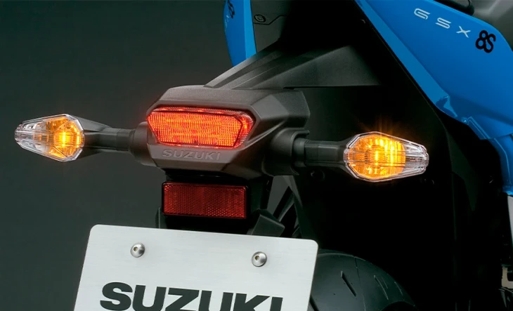 A lanterna traseira com luz de placa em LED, ambas integradas, caracteriza um novo design introduzido pela primeira vez numa motocicleta Suzuki. Montada no fino para-lama traseiro, esta nova iluminação contribui para um novo design esportivo que faz com que a GSX-8S pareça ainda mais curta e fina na traseira.